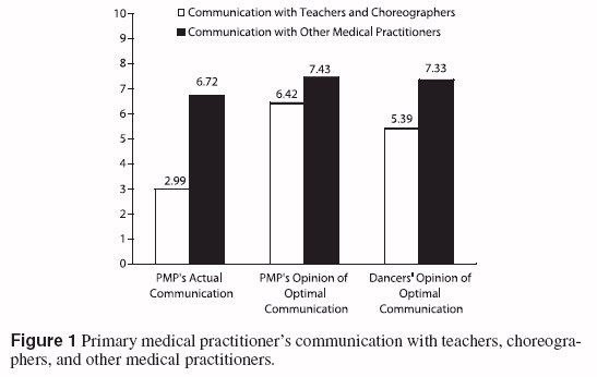 The data shows that medical practitioners rarely communicated with each other concerning a common (dance) patient. They also failed to communicate, in most cases, with the dancers’ teachers, choreographers, and directors. This was not disconcerting to injured dancers, who tended to believe that such communication was not important to their recovery. Significantly, dancers did not fully understand the nature of their injuries when they sought medical advice, and they did not press the medical practitioners for additional information. Both groups generally believed that dancers would benefit by learning more about human anatomy.