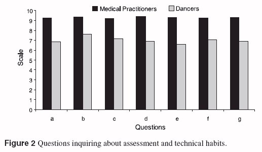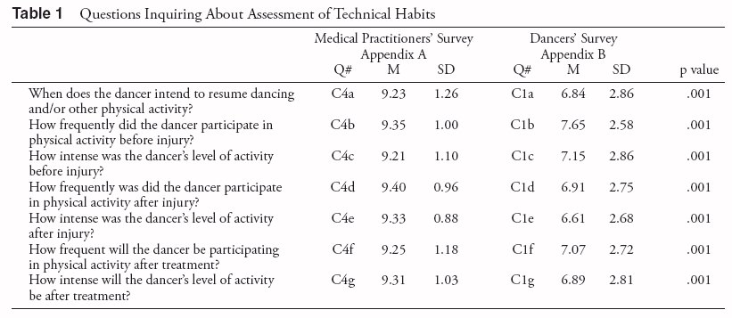 Table 1 describes these data for each question for each group, and tests of significance concerning mean differences in dancers’ and health practitioners’ reports. The difference between what the practitioners claim they ask and what the dancers believe is asked is significant with regard to each of the seven pairs of questions (p < .001).